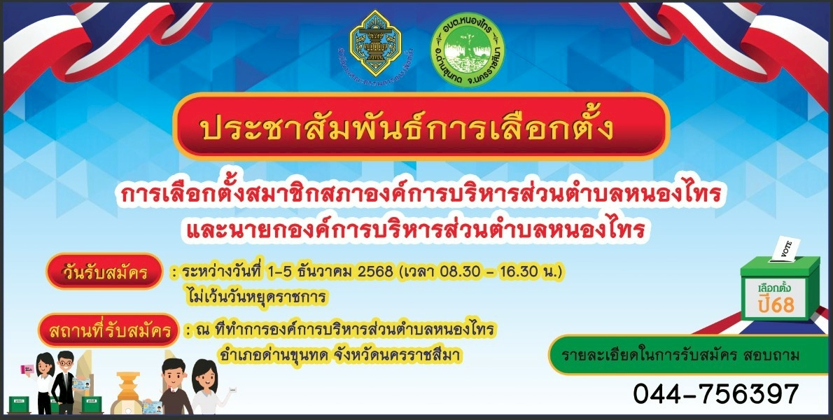 สามารถติดต่อรับใบสมัครรับเลือกตั้งได้ที่ ศูนย์ประสานงานการเลือกตั้ง บริเวณชั้น 2 สำนักปลัด อบต.หนองไทร ตั้งแต่บัดนี้เป็นต้นไป
