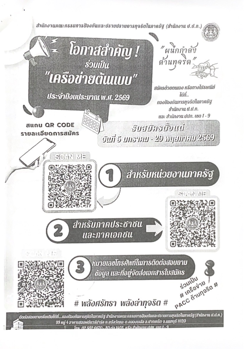 ประชาสัมพันธ์การรับสมัครคัดเลือกเครือข่ายเพื่อเข้ารับรางวัล "เครือข่ายต้นแบบในการป้องกันและเฝ้าระวังการทุจริต" ประจำปีงบประมาณ พ.ศ.2569 โดยสำนักงานคณะกรรมการป้องกันและปราบปรามทุจริตในภาครัฐ (สำนักงาน ป.ป.ท.) รายละเอียดตามเอกสารแนบ